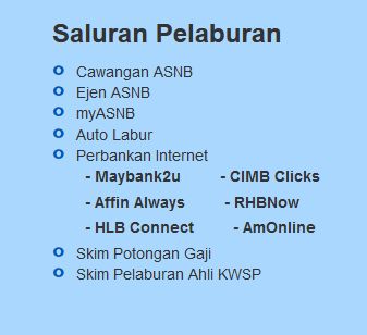- Perbankan Internet Pelabur juga boleh menggunakan perkhidmatan perbankan dalam talian yang ditawarkan bank-bank utama seperti Maybank2U, CIMB Clicks, Affin Always, RHBNow, HLB Connect, dan AmOnline untuk lakukan transaksi jual beli produk ASNB.