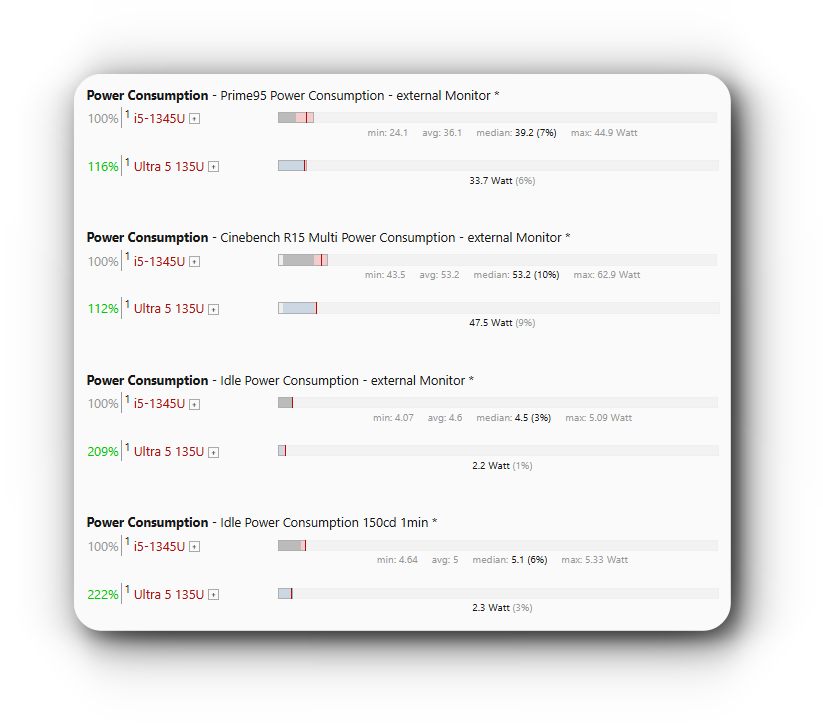 Ujian mendapati Core Ultra 5 135U sekurang-kurangnya 12% lebih jimat tenaga sewaktu bekerja dan dalam keadaan idle, ia sekali ganda lebih rendah gunakan tenaga. Ia bermakna, untuk kapasiti bateri yang sama, anda boleh jangkakan yang laptop yang diperkasa Core Ultra 5 135U ada hayat bateri lebih panjang.