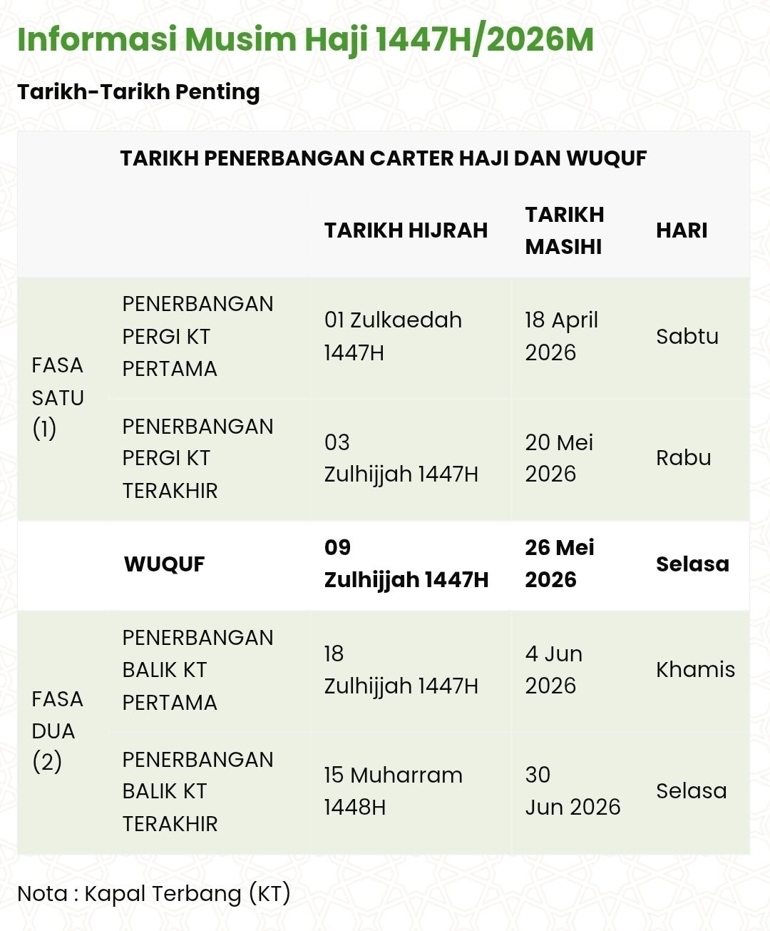 Seperti yang sedia tahu, penerbangan Haji untuk musim 2026 adalah bermula hingga 18 April hingga 20 Mei 2026.